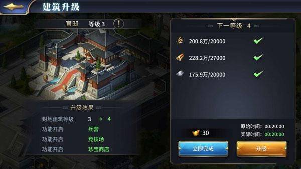 所以,能够在玩家之间拉开等级差距的,主要集中在“封地建筑升级”和“演武场”