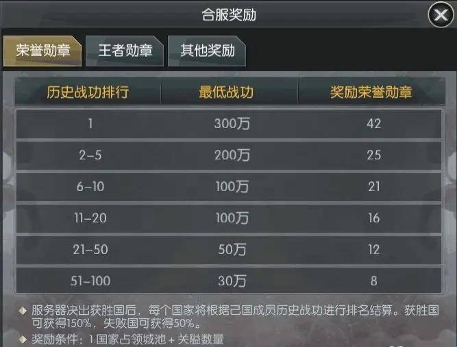 1、战胜国在当前服务器统一的时候会根据战功排行榜额外获得大量轮回勋章、王者勋章。