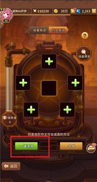 3、进入符文锻造的界面,可以看到空白的槽位,这里边放置低等级的符文,也可以直接点击下方的一键添加选项。