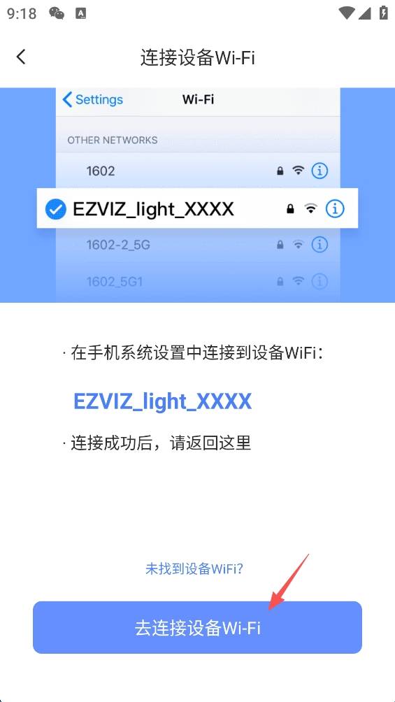 7、注意需要连接的WIFI名称,随后点击屏幕下方的“去连接设备WIFI”。
