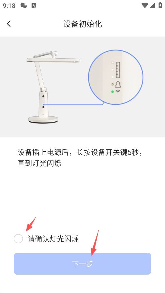 5、按照要求,确保需要连接设备是开启状态,勾选屏幕下方的“请确认灯光闪烁”,随后点击屏幕最下方的“下一步”。
