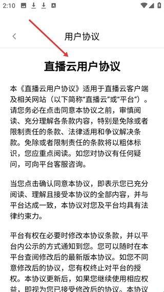 1、直播云用户协议,适用于直播云客户端及相关网站,提醒用户审慎阅读,同意即受约束,平台可修改协议。