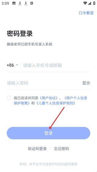 2、密码登录界面输入手机号邮箱、密码,勾选协议后点登录,也可验证码登录或找回密码,平台不提供违规培训。