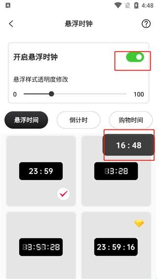 3.点击悬浮时钟,点击开启键,即可打开悬浮时间,而且还有很秒表时钟可以选择;