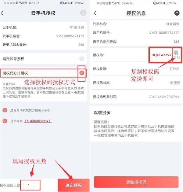 2、授权的方式有两种,第一种是生成授权码,被授权方点击头像,点击“使用授权码”,可以粘贴也可以手动输入;另一种为输入指定被授权人账号授权。(授权仅“VIP、GVIP或KVIP云手机”可使用);