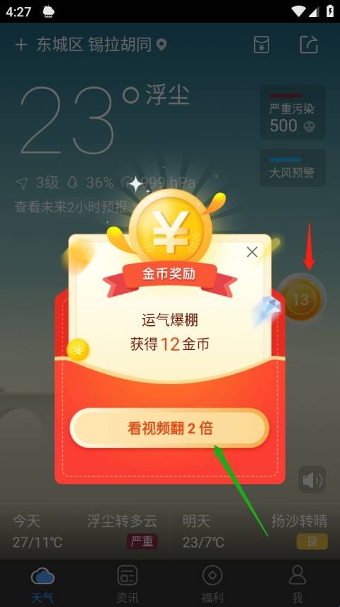 3、登录成功之后回到天气页面,点击金币即可获得相对应的金币数量,如果想获得更多金币的话,可点击看视频翻两倍,看完视频即可。