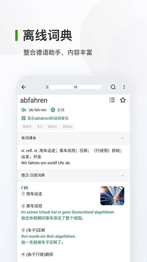 收录《每日德语听力》中的海量原声例句,内容出自你喜欢的电影、美剧,或是专业新闻和考试真题,助你了解单词的真实语境,专业高效地记忆单词。
