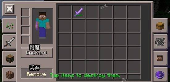 2、进入物品界面,我们能看到背包里的各种物品,还能通过附魔按钮直接附魔物品,可以为各种物品附魔,不光是武器和工具,草方块也能附魔。