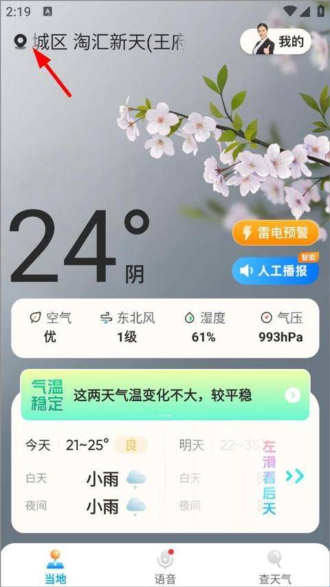 1、用户打开创奇天气app,进入当地主页,用户可查看当前天气、温度、小时预报、15日天气预报以及人工语音播报等,点击左上角定位刷新至最新位置。