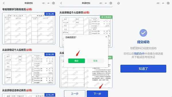 3、从业资格证违章记录页。申请人根据页面展示的上传材料示例,上传格式为png、jpg,大小不超过10M的图片并确保上传的电子影像清晰可见。上传成功的材料,右上角会显示“上传成功”字样。上传完成并确认无误后点击【下一步】进行提交。
