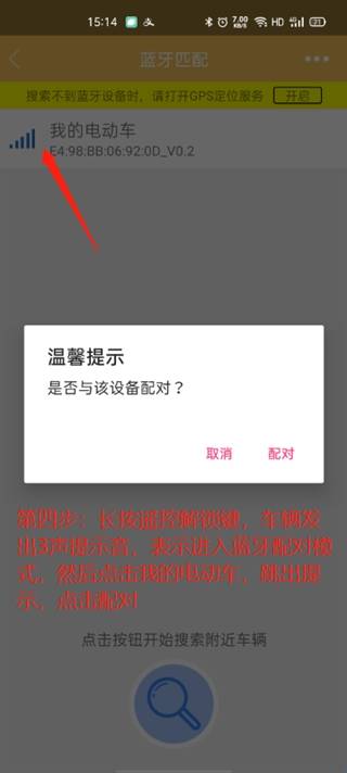 4、长按遥控解锁键,车辆发出3声提示音,表示蓝牙配对模式,然后点击我的电动车,跳出提示,点击配对