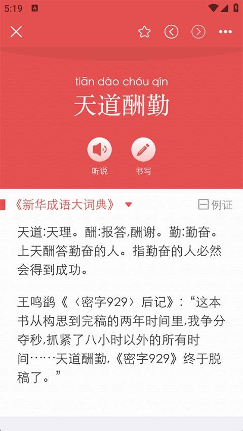 3、点击查词就会显示改成语的读音,释义以及出自来源;
