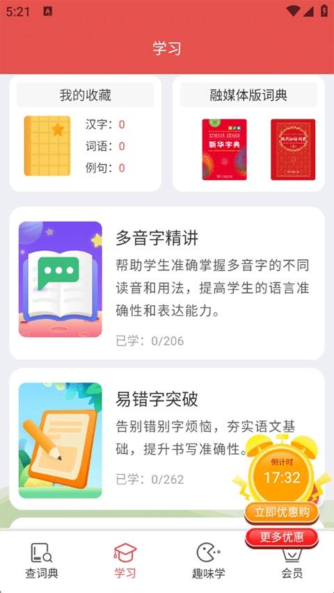 6、点击屏幕下方的学习按钮,在这里有各种如多音字精讲、易错字突破等精品课程,对于刚上学的儿童用户或想查缺补漏的学字用户是非常合适的。