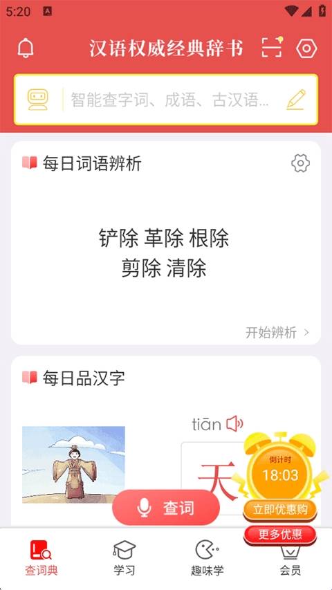提供单字、拆字、汉语拼音、注音字母、部首、笔画数、四角号码等多种检索方式,也可通过字词索引、词语分类、AI据意查词,实现字词的快速查询。