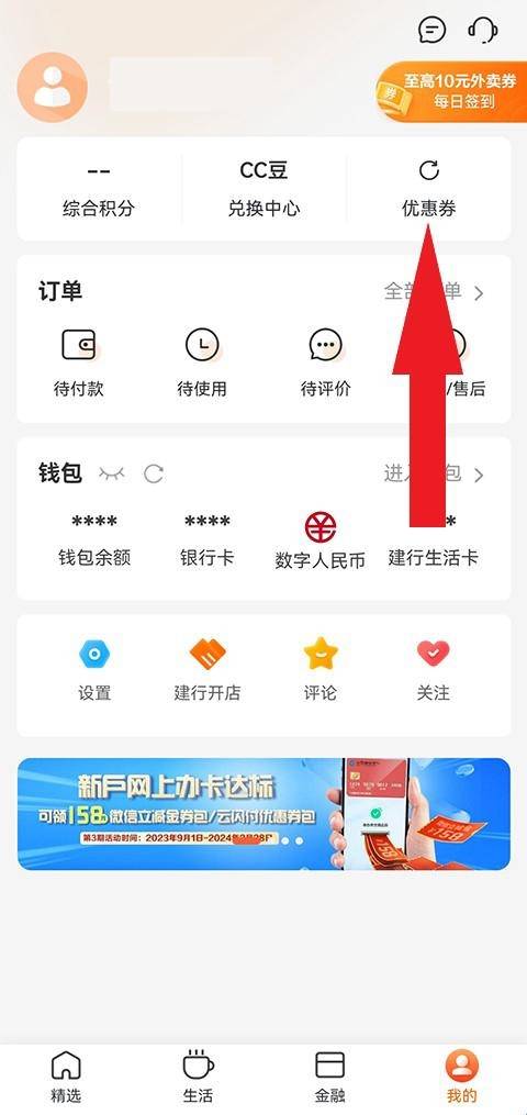 1、用户打开建行生活后,点击我的,进入个人中心,之后再点击上方的优惠券。