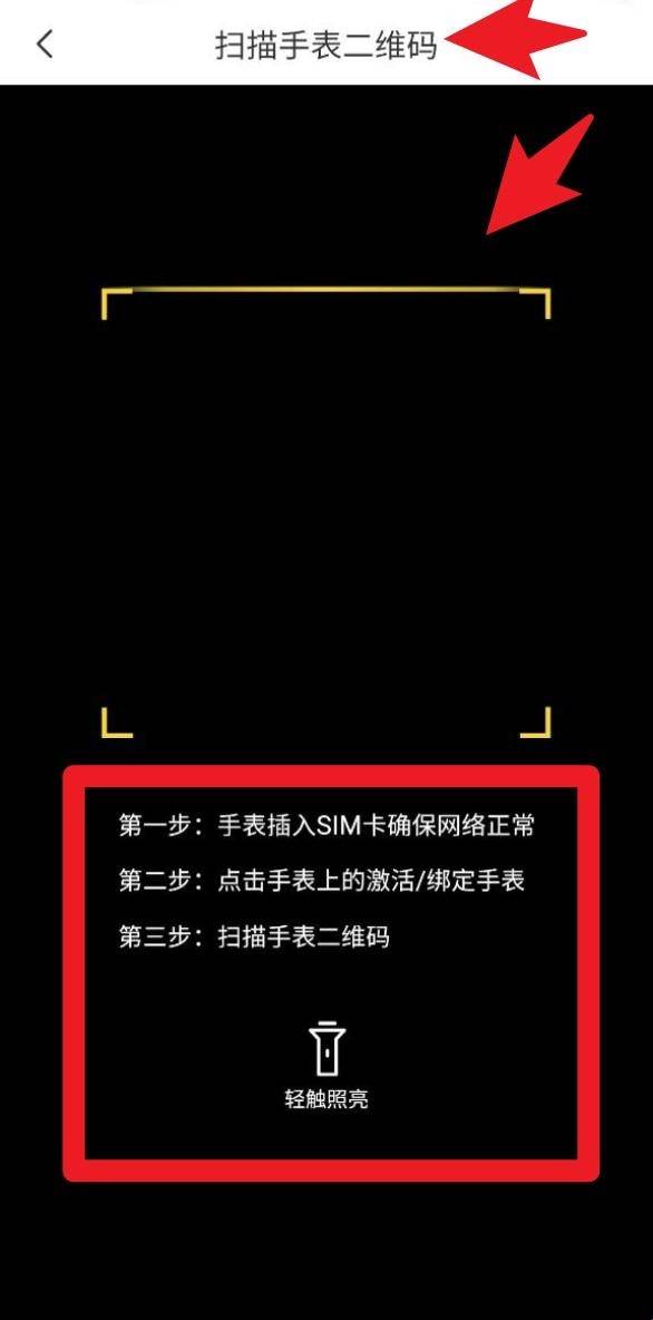 3、插入SIM卡确保手表网络正常,然后点击手表上「激活/绑定」按钮进入扫码准备。