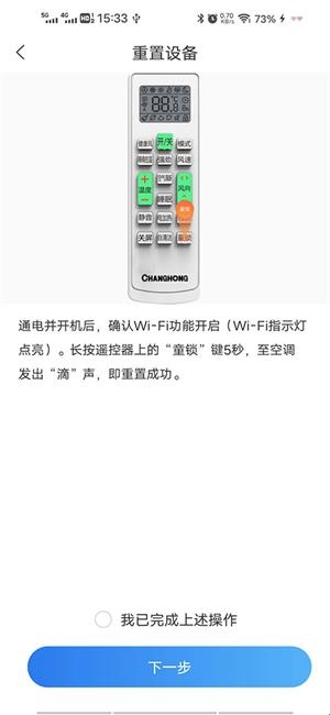 4、将空调通电并开机后,确认Wi-Fi功能开启,长按遥控器上的“童锁”键5秒,至空调发出“滴”声,点击下一步。
