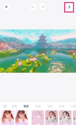 2、在图片处理界面的下方选择好你要加工的类型,在这里,大家还可以通过添加贴纸、加大或减少颜色深度等来对图片进行美化,在完成对图片的加工后,大家就可以选择并点击右上角的“下载”的选项保存自己的图片了;