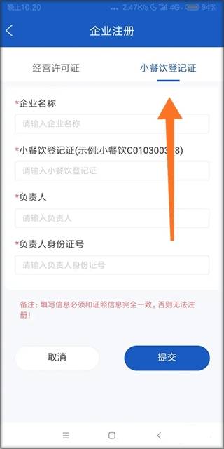 3、最后,如果要用小餐饮登记证来注册,则点击右边的选项,然后填写企业名称、登记证号码和代表人信息即可。