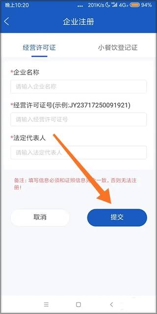 2、然后,如果你要使用经营许可证进行注册,则点击左边的选项,然后输入企业名称、经营许可证号和法定代表人,点击“提交”即可。