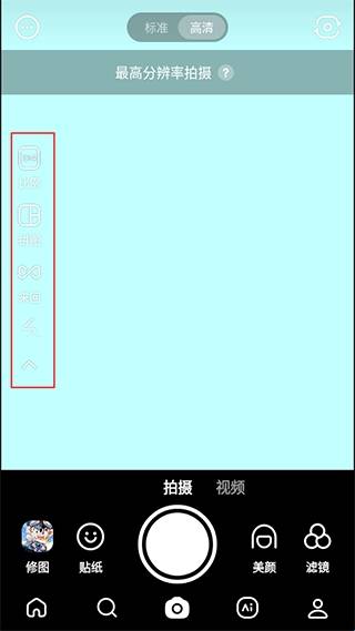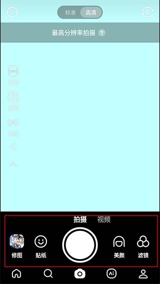 1、下方菜单栏可以切换拍摄或视频功能,可以在照片和视频上直接添加贴纸,进行美颜和切换不同的滤镜。
