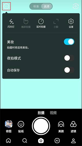 3、点击上方的三点标志,可以对拍照进行更精准的设置,例如美妆功能,夜拍模式,自动保存,延时拍摄等等。