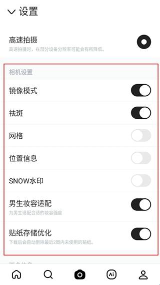 4、在设置界面,可以关闭位置信息,水印等不常用功能,开启祛斑、网格、男生妆容适配等常用功能。