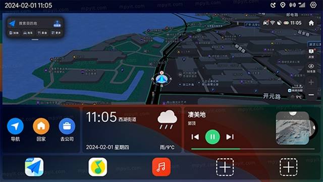 2、中间地图显示,右侧多功能快捷显示天气、音乐、导航等信息。
