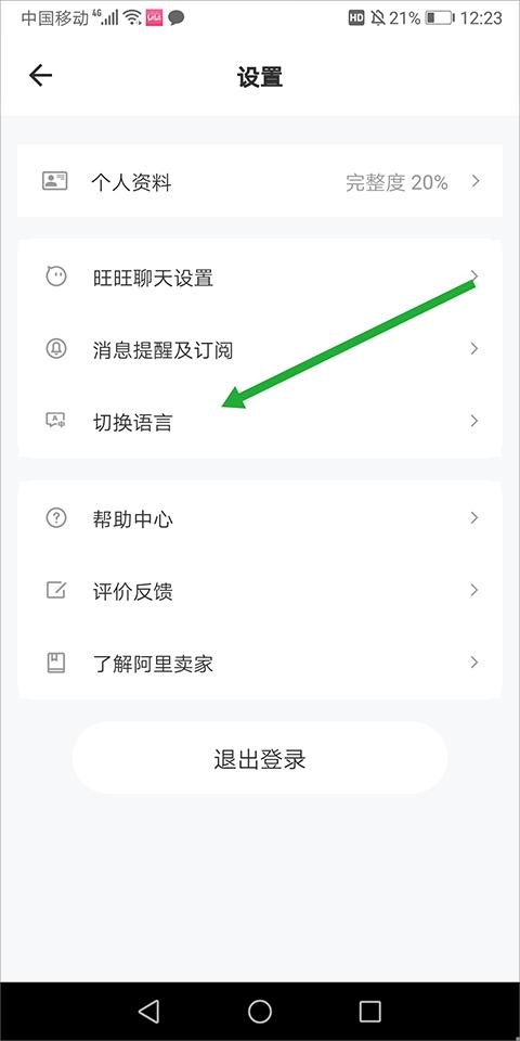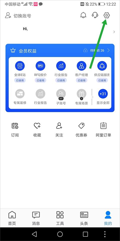1、打开并登录阿里卖家国际版,即阿里卖家app,进入【我的】页面中点击右上角的设置图标(下图绿色箭头所指)。