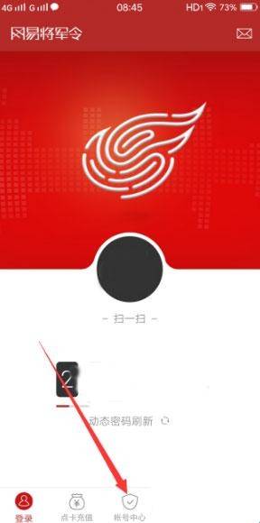 1、首先,我们在手机里找到“网易将军令”app图标,点击进入主界面,接着,我们能看到如图所示的动态码,请大家选择屏幕*下面的“账号中心”按钮。