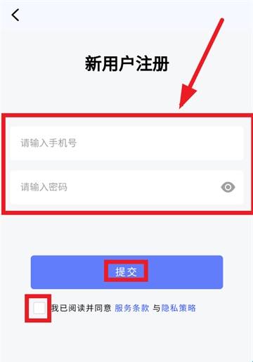3、在新用户注册界面,输入手机号,密码,勾选我已阅读并同意服务条款与隐私策略,点击提交即可。