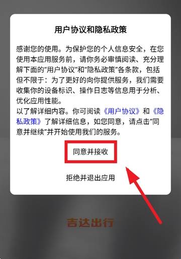 1、打开吉达出行,在用户协议和隐私政策提示界面点击同意并接受。