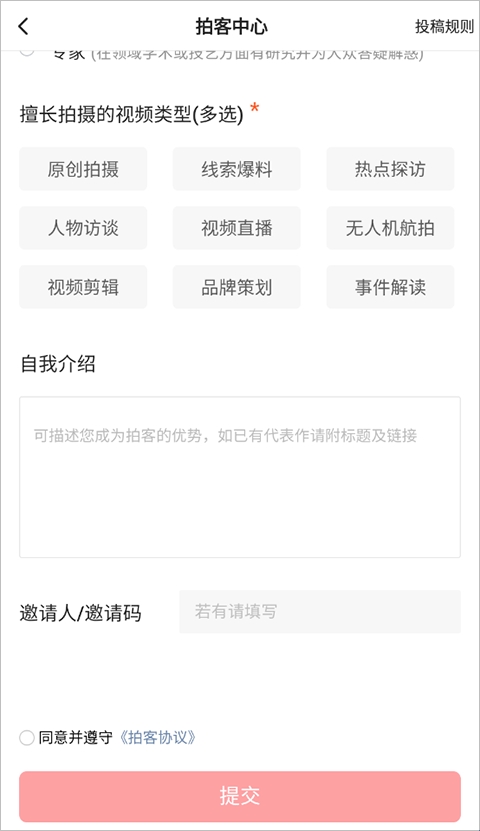 3、最后填写个人的所在地、擅长视频类型等基础信息,点击完成即可完成拍客入驻。