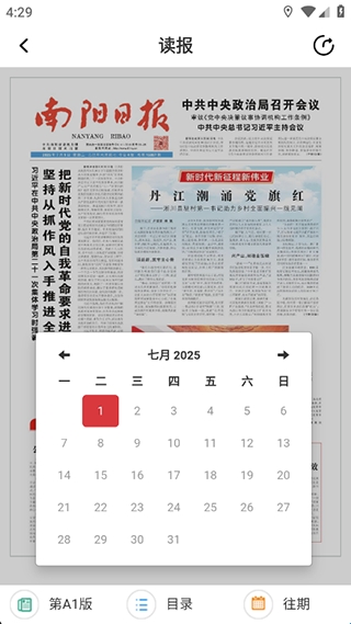 3、.进入读报界面,下方可以选择报纸日期,目录和版面。