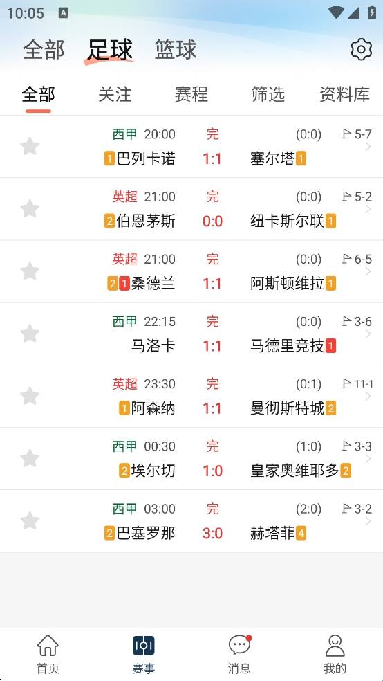 5、以仅选择英超、西甲为例,选好之后,就可以看到,赛事里就只有这两项足球赛事的比赛信息了。