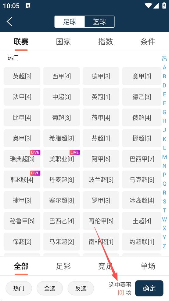 4、先点击【全选】,然后点击【反选】,选中赛事为0时,就可以挑选你想要关注的比赛了。