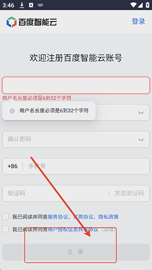 2、没有账号,可以点击右上角注册,输入基本信息,点击注册。
