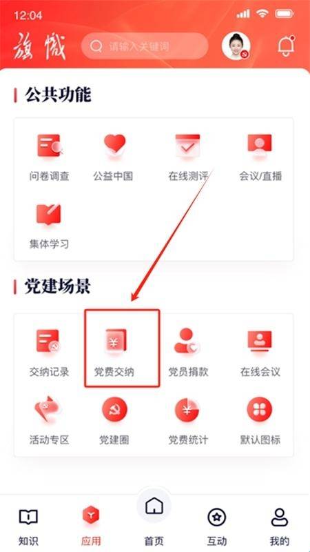 3、进入软件后需要缴纳党费的,可以点击应用,在党建场景中找到党费缴纳进入缴费即可。