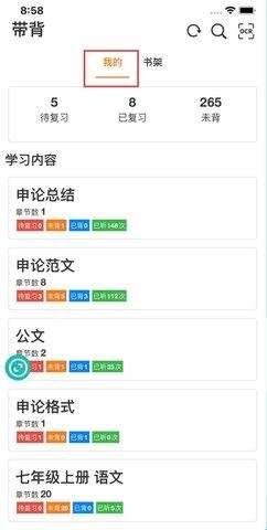 1、进入带背APP,点击顶部我的标签,加载个人学习数据,查看待复习、已复习、未背等任务统计,分析学习进度。