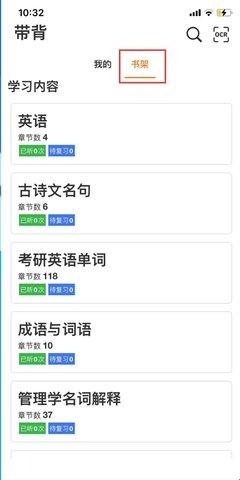 2、切换至书架标签页,浏览学习内容列表,涵盖英语、古诗文名句等分类,按需选取目标学习资料,触发学习流程。