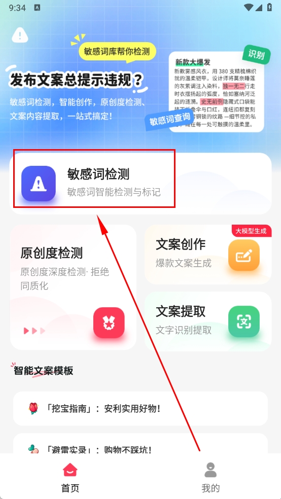 2、打开进入软件,在首页找到并点击敏感词检测。