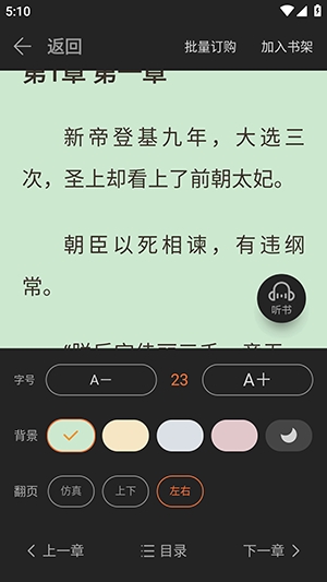 3、可以调整字体大小、颜色、背景等,还可设置翻页模式、亮度调节等。