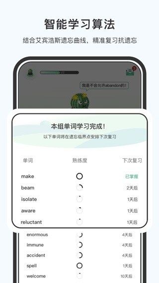 3、单词熟知度和背诵次数,记忆持久度实时更新。