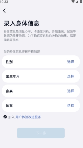 4、用户根据平台的要求需要录入个人的身体信息,如性别,身高,出生年月日,体重等等。