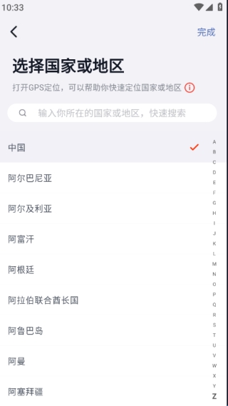 3、使用之前需要选择国家或地区,在搜索栏内可以快速搜索输入。