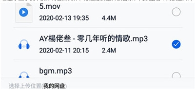 3、软件会显示出手机中的所有音频文件,点选想要上传的音乐,再点击上传即可。
