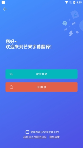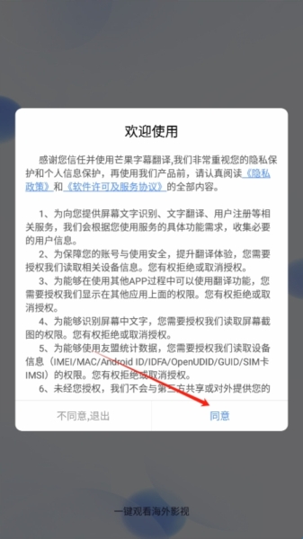 2、进入后阅读并同意芒果字幕翻译app的用户协议。