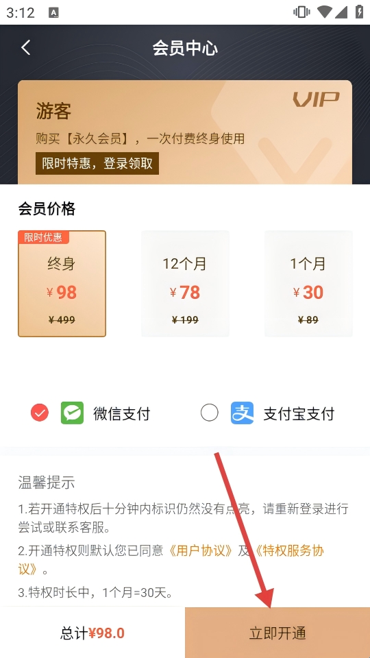 3、在会员中心页面,选择会员时长及支付方式,点击【立即开通】。
