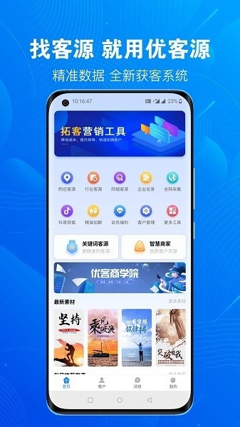 优客源是一款由日照微晨网络科技有限公司打造的客源管理拓展工具。软件适用于工商、个体户和商铺,用户可以在这里发布自己的需求、技能和资源,与其他用户进行互动交流,帮助用户开拓人际关系、降低获客成本、提升转化率。