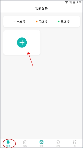 1、打开软件后自动进入到“饮水”界面,跳转到“设备”这个模块后,点击上方的加号图标。
